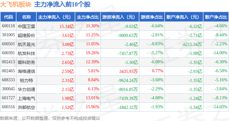 从资金流向上来看,当日大飞机板块主力资金净流入38.26亿元,游资资金净流出23.05亿元,散户资金净流出15.21亿元。大飞机板块个股资金流向见下表: