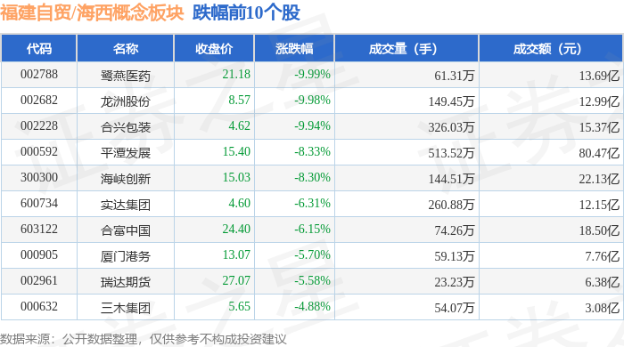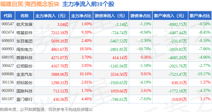 从资金流向上来看,当日福建自贸/海西概念板块主力资金净流出32.45亿元,游资资金净流出7.5亿元,散户资金净流入39.94亿元。福建自贸/海西概念板块个股资金流向见下表: