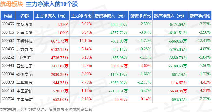 从资金流向上来看,当日航母板块主力资金净流出6.3亿元,游资资金净流出3.19亿元,散户资金净流入9.49亿元。航母板块个股资金流向见下表: