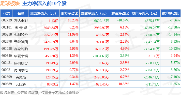 从资金流向上来看,当日足球板块主力资金净流入1113.47万元,游资资金净流入9432.37万元,散户资金净流出1.05亿元。足球板块个股资金流向见下表: