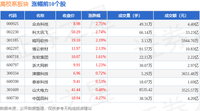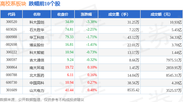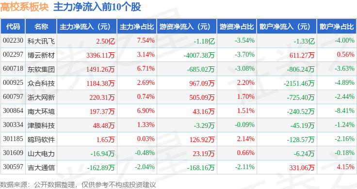 从资金流向上来看,当日高校系板块主力资金净流出3.46亿元,游资资金净流入1221.94万元,散户资金净流入3.33亿元。高校系板块个股资金流向见下表: