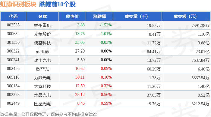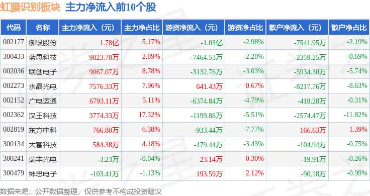 从资金流向上来看,当日虹膜识别板块主力资金净流入2.69亿元,游资资金净流出3.36亿元,散户资金净流入6738.91万元。虹膜识别板块个股资金流向见下表: