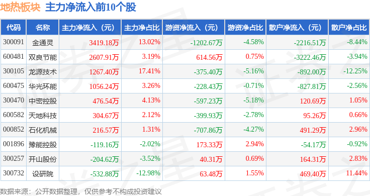 从资金流向上来看,当日地热板块主力资金净流出5.67亿元,游资资金净流出1.78亿元,散户资金净流入7.45亿元。地热板块个股资金流向见下表: