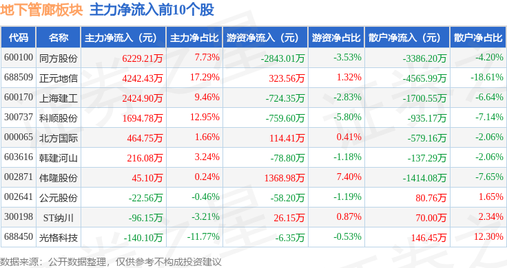 从资金流向上来看,当日地下管廊板块主力资金净流出3.05亿元,游资资金净流入1.07亿元,散户资金净流入1.98亿元。地下管廊板块个股资金流向见下表: