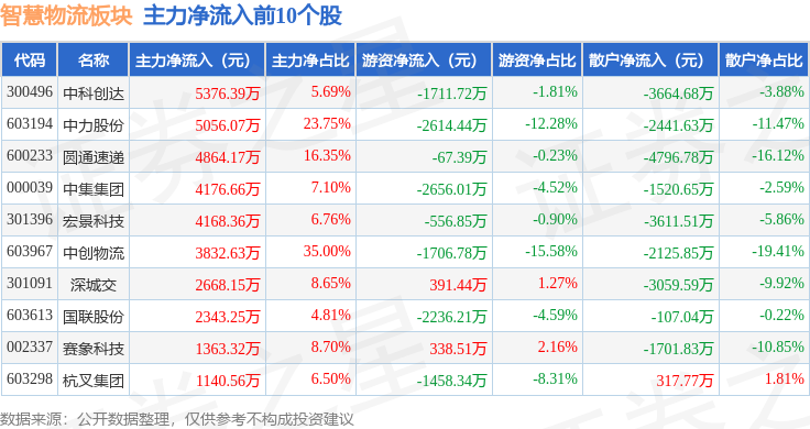 从资金流向上来看,当日智慧物流板块主力资金净流出13.77亿元,游资资金净流入1.74亿元,散户资金净流入12.02亿元。智慧物流板块个股资金流向见下表: