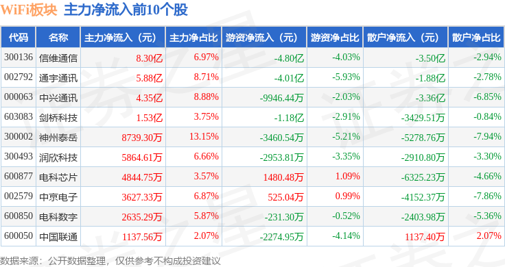 从资金流向上来看,当日WiFi板块主力资金净流入11.95亿元,游资资金净流出8.53亿元,散户资金净流出3.42亿元。WiFi板块个股资金流向见下表:
