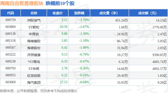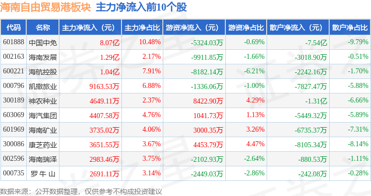从资金流向上来看,当日海南自由贸易港板块主力资金净流入11.93亿元,游资资金净流出1.36亿元,散户资金净流出10.57亿元。海南自由贸易港板块个股资金流向见下表: