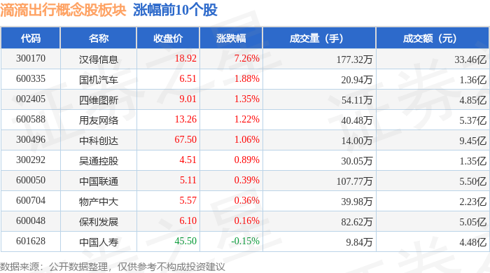证券之星消息,12月31日滴滴出行概念股板块较上一交易日上涨0.04%,汉得信息领涨。当日上证指数报收于3968.84,上涨0.09%。深证成指报收于13525.02,下跌0.58%。滴滴出行概念股板块个股涨跌见下表: