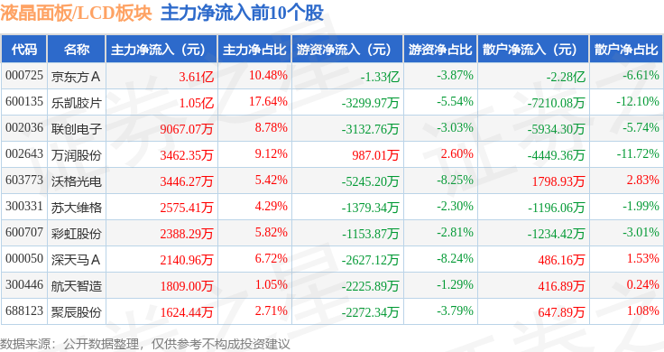 从资金流向上来看,当日液晶面板/LCD板块主力资金净流出12.91亿元,游资资金净流入4297.5万元,散户资金净流入12.48亿元。液晶面板/LCD板块个股资金流向见下表: