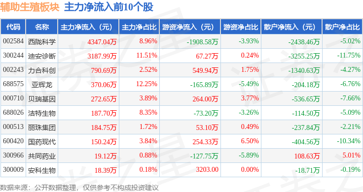 从资金流向上来看,当日辅助生殖板块主力资金净流出3.25亿元,游资资金净流入9620.87万元,散户资金净流入2.28亿元。辅助生殖板块个股资金流向见下表: