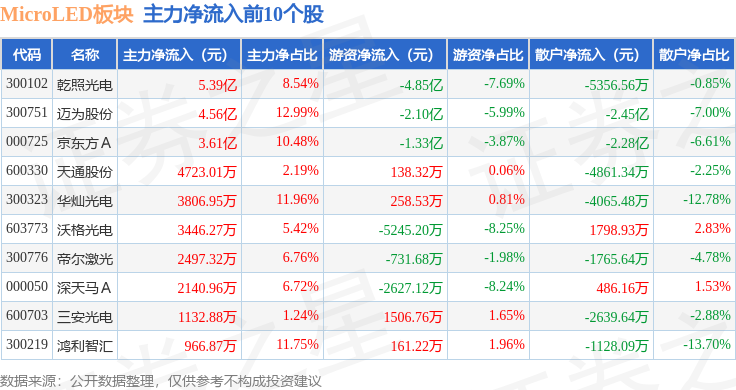 从资金流向上来看,当日MicroLED板块主力资金净流入8.94亿元,游资资金净流出6.26亿元,散户资金净流出2.68亿元。MicroLED板块个股资金流向见下表:
