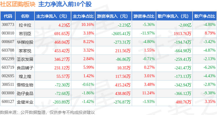 从资金流向上来看,当日社区团购板块主力资金净流出1.65亿元,游资资金净流出2.72亿元,散户资金净流入4.37亿元。社区团购板块个股资金流向见下表: