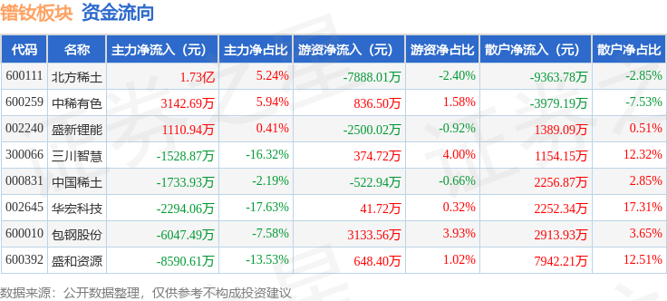 从资金流向上来看,当日镨钕板块主力资金净流入1310.47万元,游资资金净流出5876.08万元,散户资金净流入4565.62万元。镨钕板块个股资金流向见下表: