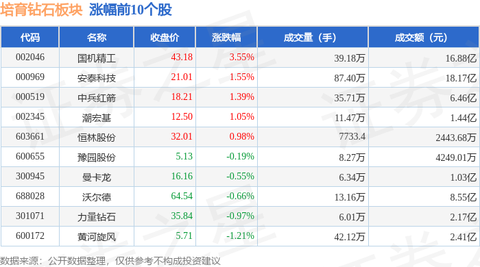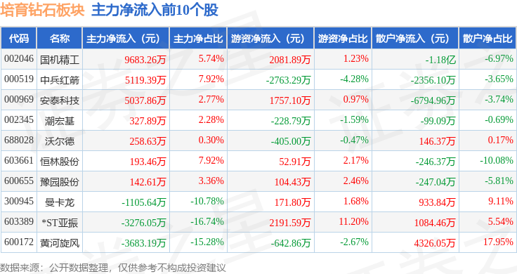 从资金流向上来看,当日培育钻石板块主力资金净流出7452.81万元,游资资金净流入4340.72万元,散户资金净流入3112.1万元。培育钻石板块个股资金流向见下表: