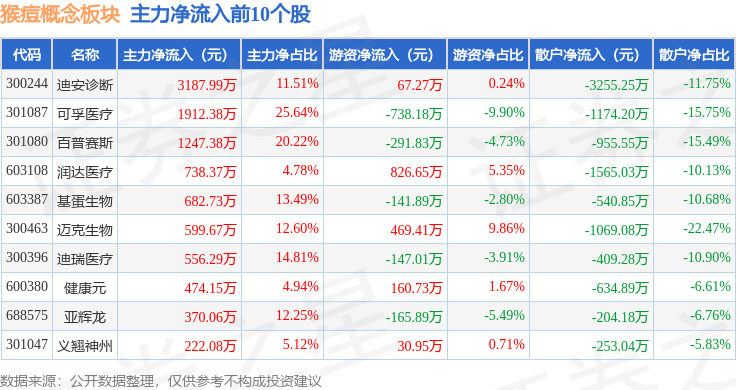 从资金流向上来看,当日猴痘概念板块主力资金净流出3.71亿元,游资资金净流入4888.17万元,散户资金净流入3.22亿元。猴痘概念板块个股资金流向见下表: