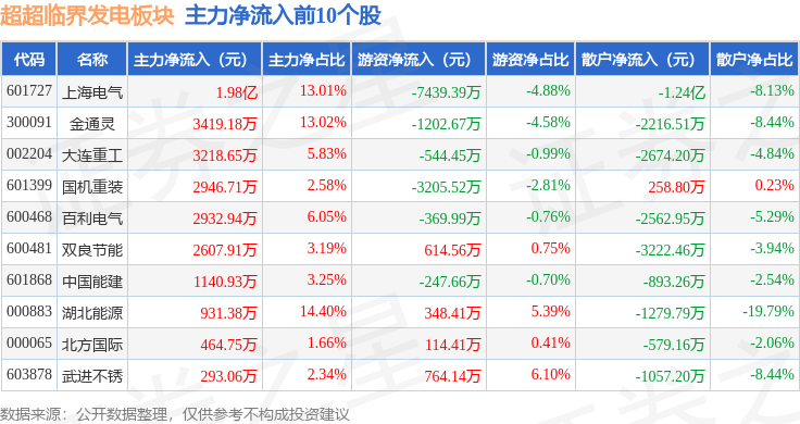 从资金流向上来看,当日超超临界发电板块主力资金净流出8.72亿元,游资资金净流入3.05亿元,散户资金净流入5.67亿元。超超临界发电板块个股资金流向见下表: