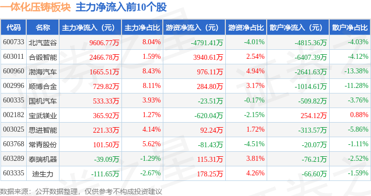 从资金流向上来看,当日一体化压铸板块主力资金净流出7.12亿元,游资资金净流入3.03亿元,散户资金净流入4.09亿元。一体化压铸板块个股资金流向见下表: