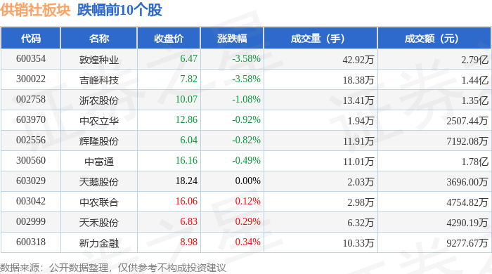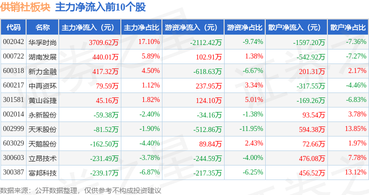 从资金流向上来看,当日供销社板块主力资金净流出4977.61万元,游资资金净流出2419.41万元,散户资金净流入7397.02万元。供销社板块个股资金流向见下表: