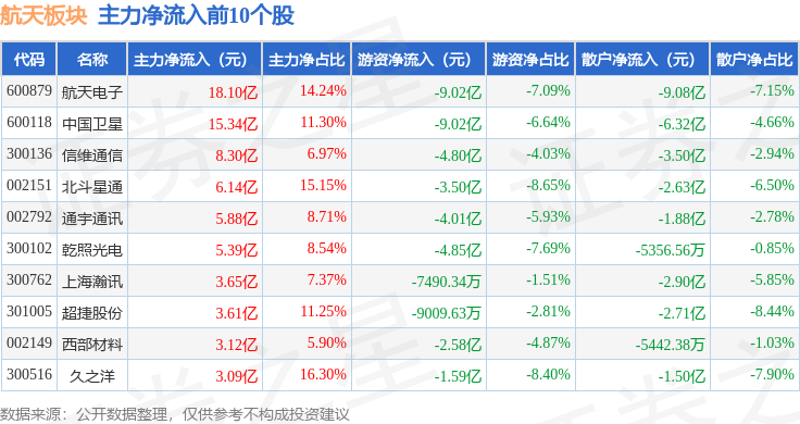 从资金流向上来看,当日航天板块主力资金净流入55.16亿元,游资资金净流出45.23亿元,散户资金净流出9.93亿元。航天板块个股资金流向见下表: