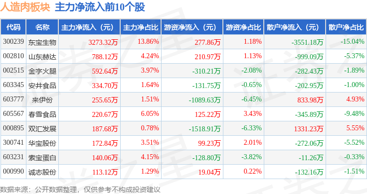 从资金流向上来看,当日人造肉板块主力资金净流出3.11亿元,游资资金净流入845.51万元,散户资金净流入3.03亿元。人造肉板块个股资金流向见下表: