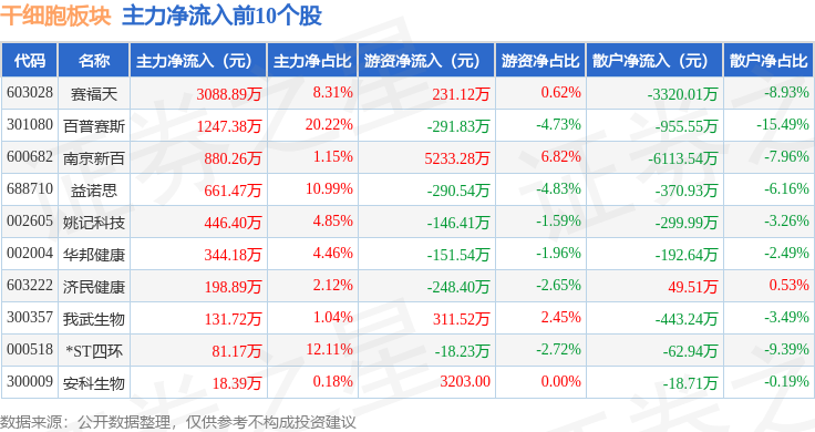 从资金流向上来看,当日干细胞板块主力资金净流出1.44亿元,游资资金净流入1.13亿元,散户资金净流入3081.55万元。干细胞板块个股资金流向见下表: