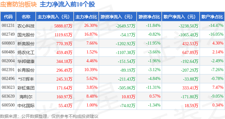 从资金流向上来看,当日虫害防治板块主力资金净流出4406.72万元,游资资金净流出4203.6万元,散户资金净流入8610.31万元。虫害防治板块个股资金流向见下表: