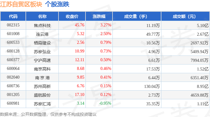 证券之星消息,12月31日江苏自贸区板块较上一交易日上涨0.73%,焦点科技领涨。当日上证指数报收于3968.84,上涨0.09%。深证成指报收于13525.02,下跌0.58%。江苏自贸区板块个股涨跌见下表: