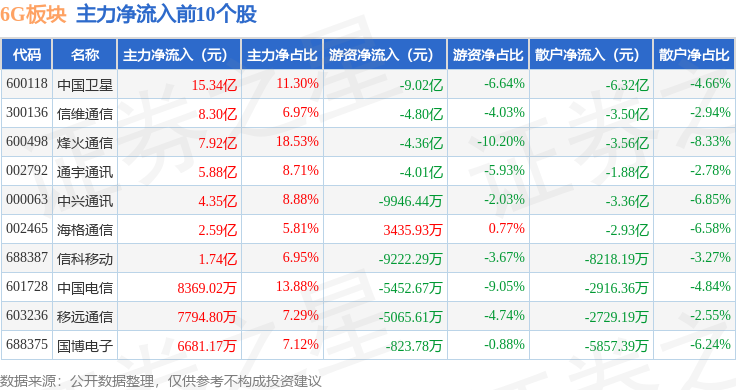 从资金流向上来看,当日6G板块主力资金净流入40.52亿元,游资资金净流出25.98亿元,散户资金净流出14.53亿元。6G板块个股资金流向见下表: