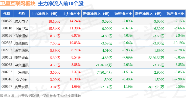 从资金流向上来看,当日卫星互联网板块主力资金净流入91.66亿元,游资资金净流出49.38亿元,散户资金净流出42.29亿元。卫星互联网板块个股资金流向见下表: