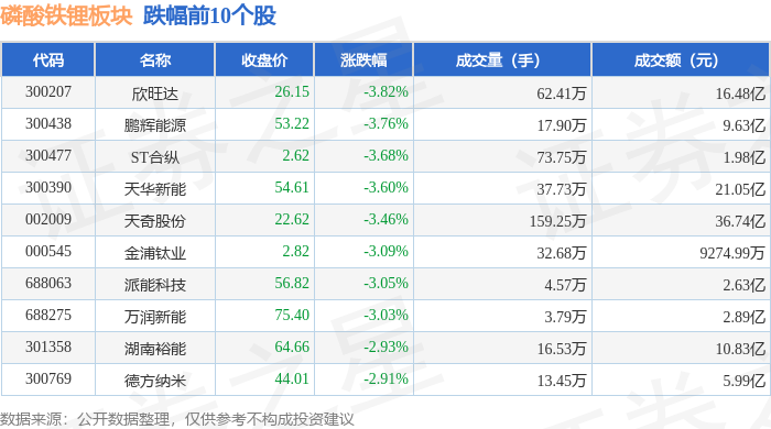 从资金流向上来看,当日磷酸铁锂板块主力资金净流出28.46亿元,游资资金净流入6.43亿元,散户资金净流入22.03亿元。磷酸铁锂板块个股资金流向见下表:
