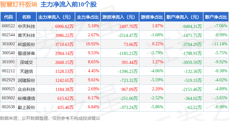 从资金流向上来看,当日智慧灯杆板块主力资金净流出4.84亿元,游资资金净流入1.6亿元,散户资金净流入3.23亿元。智慧灯杆板块个股资金流向见下表:
