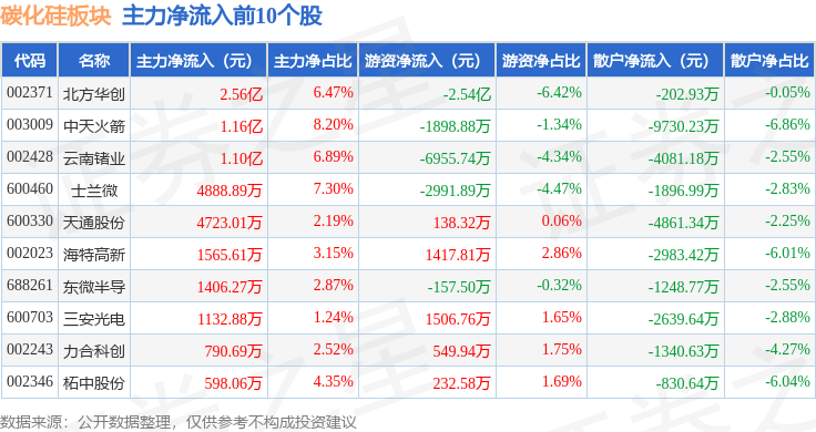 从资金流向上来看,当日碳化硅板块主力资金净流出10.69亿元,游资资金净流出5491.04万元,散户资金净流入11.24亿元。碳化硅板块个股资金流向见下表: