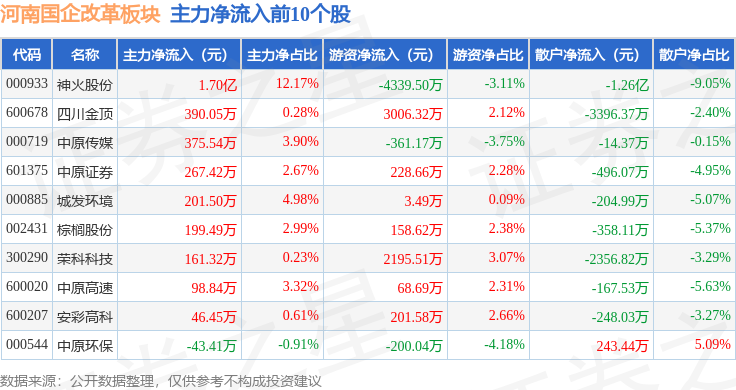 从资金流向上来看,当日河南国企改革板块主力资金净流出1.93亿元,游资资金净流入2638.46万元,散户资金净流入1.67亿元。河南国企改革板块个股资金流向见下表: