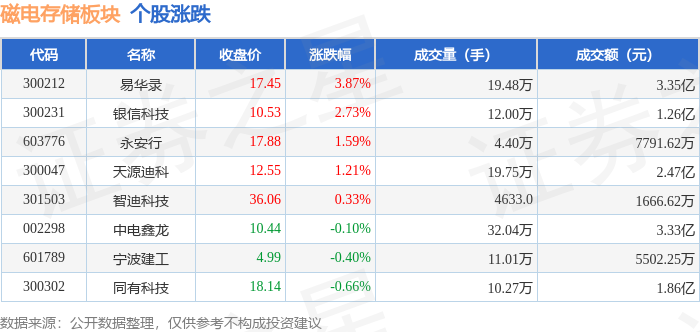 证券之星消息,12月31日磁电存储板块较上一交易日上涨1.39%,易华录领涨。当日上证指数报收于3968.84,上涨0.09%。深证成指报收于13525.02,下跌0.58%。磁电存储板块个股涨跌见下表: