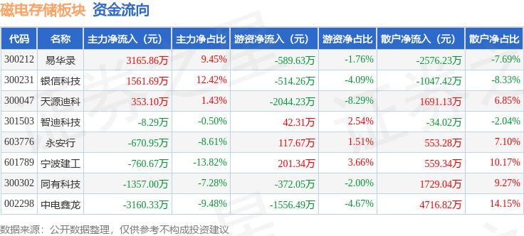 从资金流向上来看,当日磁电存储板块主力资金净流出876.59万元,游资资金净流出4715.34万元,散户资金净流入5591.93万元。磁电存储板块个股资金流向见下表: