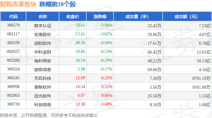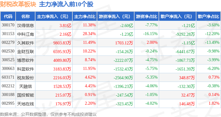从资金流向上来看,当日财税改革板块主力资金净流入1.63亿元,游资资金净流出3.52亿元,散户资金净流入1.89亿元。财税改革板块个股资金流向见下表: