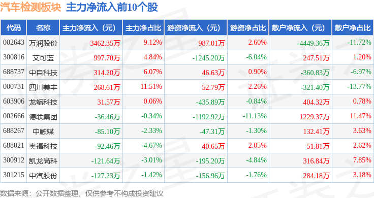 从资金流向上来看,当日汽车检测板块主力资金净流出3.17亿元,游资资金净流入1.88亿元,散户资金净流入1.29亿元。汽车检测板块个股资金流向见下表: