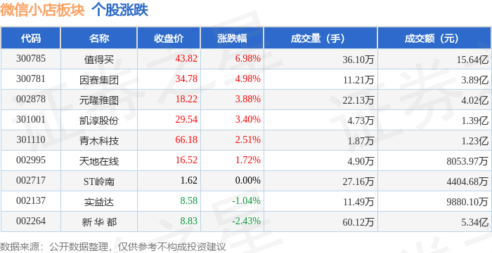 证券之星消息,12月31日微信小店板块较上一交易日上涨2.2%,值得买领涨。当日上证指数报收于3968.84,上涨0.09%。深证成指报收于13525.02,下跌0.58%。微信小店板块个股涨跌见下表: