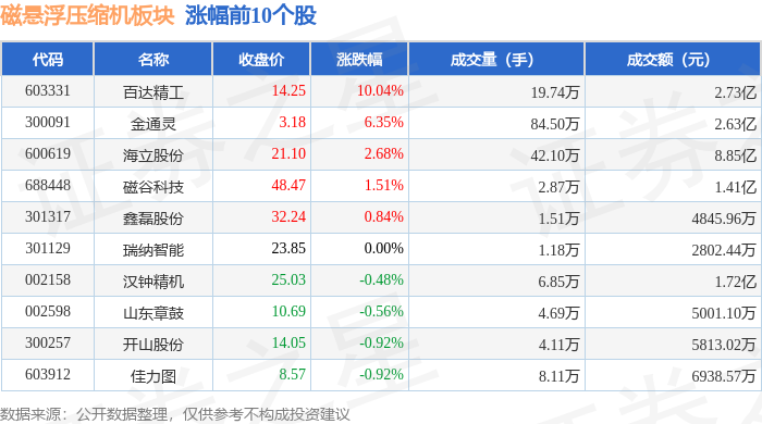 从资金流向上来看,当日磁悬浮压缩机板块主力资金净流出1.17亿元,游资资金净流出1.32亿元,散户资金净流入2.49亿元。磁悬浮压缩机板块个股资金流向见下表:
