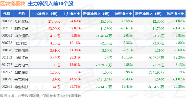 从资金流向上来看,当日区块链板块主力资金净流入53.03亿元,游资资金净流出32.98亿元,散户资金净流出20.04亿元。区块链板块个股资金流向见下表: