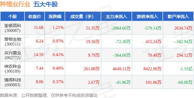 个股表现方面,种植业行业当日领涨股为荃银高科(300087),该股当日报收11.68,上涨1.21%,成交量51.35万,主力资金净流出2064.6万元。雪榕生物(300511)以上涨0.97%紧随其后,该股当日成交量19.3万,主力资金净流出72.3万元。除此之外,众兴菌业(002772)、神农种业(300189)、博闻科技(600883)均进入当日牛股之列。具体个股列表见下表: