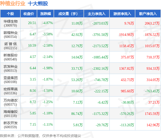 个股表现方面,种植业行业当日领跌股为华绿生物(300970),该股当日报收20.51,下跌4.87%,成交量11.09万,主力资金净流出2073.03万元。敦煌种业(600354)以下跌3.58%紧随其后,该股当日成交量42.92万,主力资金净流出3791.5万元。除此之外,诺 普 信(002215)、新赛股份(600540)、农发种业(600313)均进入当日熊股之列。具体个股列表见下表: