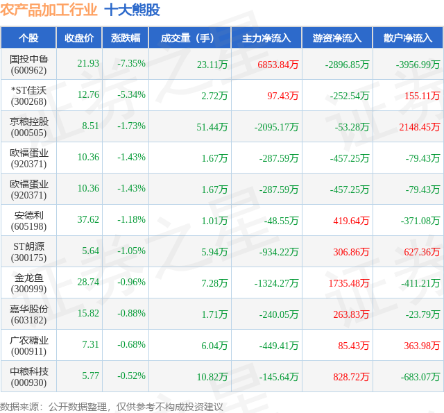 个股表现方面,农产品加工行业当日领跌股为国投中鲁(600962),该股当日报收21.93,下跌7.35%,成交量23.11万,主力资金净流入6853.84万元。*ST佳沃(300268)以下跌5.34%紧随其后,该股当日成交量2.72万,主力资金净流入97.43万元。除此之外,京粮控股(000505)、欧福蛋业(920371)、欧福蛋业(920371)均进入当日熊股之列。具体个股列表见下表: