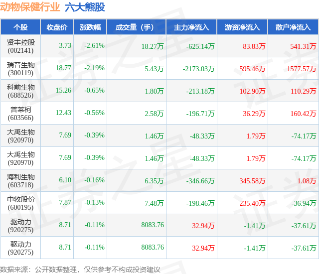 个股表现方面,动物保健行业当日领跌股为贤丰控股(002141),该股当日报收3.73,下跌2.61%,成交量18.27万,主力资金净流出625.14万元。瑞普生物(300119)以下跌2.19%紧随其后,该股当日成交量5.43万,主力资金净流出2173.03万元。除此之外,科前生物(688526)、普莱柯(603566)、大禹生物(920970)均进入当日熊股之列。具体个股列表见下表: