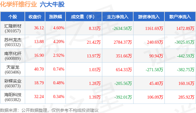 个股表现方面,化学纤维行业当日领涨股为汇隆新材(301057),该股当日报收36.12,上涨4.6%,成交量8.33万,主力资金净流出2634.58万元。苏州龙杰(603332)以上涨4.2%紧随其后,该股当日成交量21.42万,主力资金净流入2784.37万元。除此之外,南京化纤(600889)、天富龙(603406)、彩蝶实业(603073)均进入当日牛股之列。具体个股列表见下表: