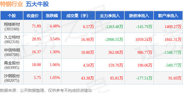 个股表现方面,特钢行业当日领涨股为翔楼新材(301160),该股当日报收71.89,上涨4.48%,成交量6.57万,主力资金净流出1263.48万元。久立特材(002318)以上涨3.54%紧随其后,该股当日成交量16.9万,主力资金净流出2900.55万元。除此之外,中信特钢(000708)、甬金股份(603995)、沙钢股份(002075)均进入当日牛股之列。具体个股列表见下表: