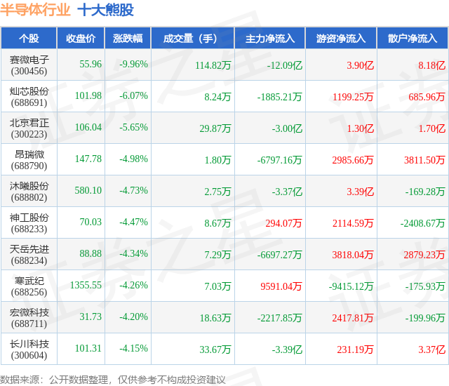 个股表现方面,半导体行业当日领跌股为赛微电子(300456),该股当日报收55.96,下跌9.96%,成交量114.82万,主力资金净流出12.09亿元。灿芯股份(688691)以下跌6.07%紧随其后,该股当日成交量8.24万,主力资金净流出1885.21万元。除此之外,北京君正(300223)、昂瑞微(688790)、沐曦股份(688802)均进入当日熊股之列。具体个股列表见下表: