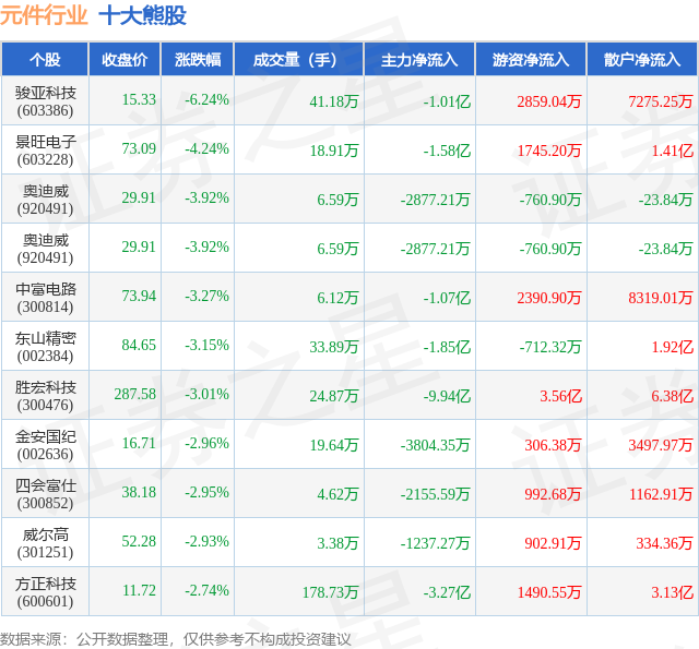 个股表现方面,元件行业当日领跌股为骏亚科技(603386),该股当日报收15.33,下跌6.24%,成交量41.18万,主力资金净流出1.01亿元。景旺电子(603228)以下跌4.24%紧随其后,该股当日成交量18.91万,主力资金净流出1.58亿元。除此之外,奥迪威(920491)、奥迪威(920491)、中富电路(300814)均进入当日熊股之列。具体个股列表见下表: