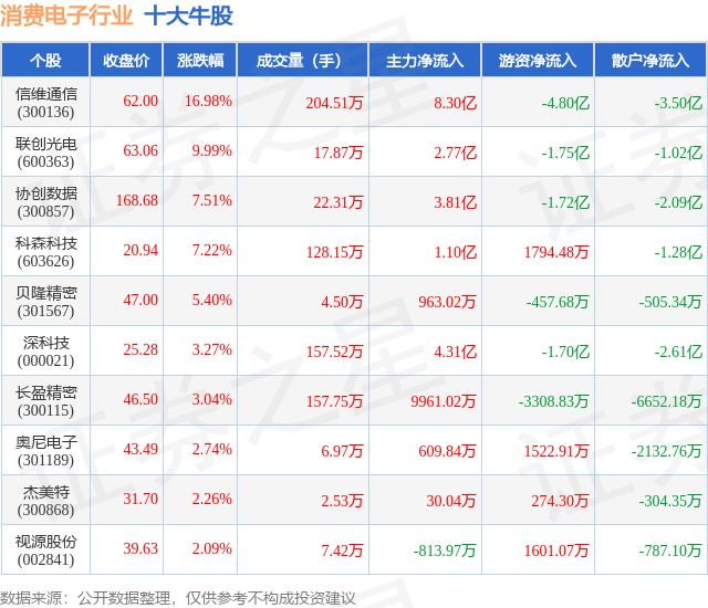 个股表现方面,消费电子行业当日领涨股为信维通信(300136),该股当日报收62.0,上涨16.98%,成交量204.51万,主力资金净流入8.3亿元。联创光电(600363)以上涨9.99%紧随其后,该股当日成交量17.87万,主力资金净流入2.77亿元。除此之外,协创数据(300857)、科森科技(603626)、贝隆精密(301567)均进入当日牛股之列。具体个股列表见下表: