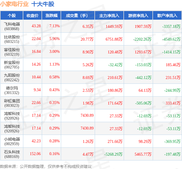 个股表现方面,小家电行业当日领涨股为飞科电器(603868),该股当日报收43.28,上涨7.13%,成交量6.35万,主力资金净流入1449.59万元。比依股份(603215)以上涨5.96%紧随其后,该股当日成交量20.77万,主力资金净流入6751.88万元。除此之外,富佳股份(603219)、新宝股份(002705)、九阳股份(002242)均进入当日牛股之列。具体个股列表见下表: